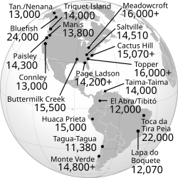 “Historically, many authors argued for a "Clovis first" paradigm, where Clovis, which represents the earliest recognisable archaeological culture in North America,[14] were suggested to represent the earliest inhabitants of the Americas south of the Laurentide Ice Sheet. However, since the beginning of the 21st century, this hypothesis has been abandoned by most researchers,[63] as several widely accepted sites, notably Monte Verde II in Chile (c. 14,500 years BP)[68] as well as Paisley Caves in Oregon (c. 14,200 years BP)[69] and Cooper's Ferry in Idaho (c. 15,800 years BP)[70] are suggested to be considerably older than the oldest Clovis sites. Historically, it was suggested that the ancestors of the people who produced the Clovis culture migrated into North America along the "ice-free corridor", but many later scholars have suggested that a migration along the Pacific coast is more likely,[71] and that the fluted projectile point style of the Clovis culture originated in temperate North America south of the ice sheet and was later transported northwards along the expanding ice-free corridor.[72]“